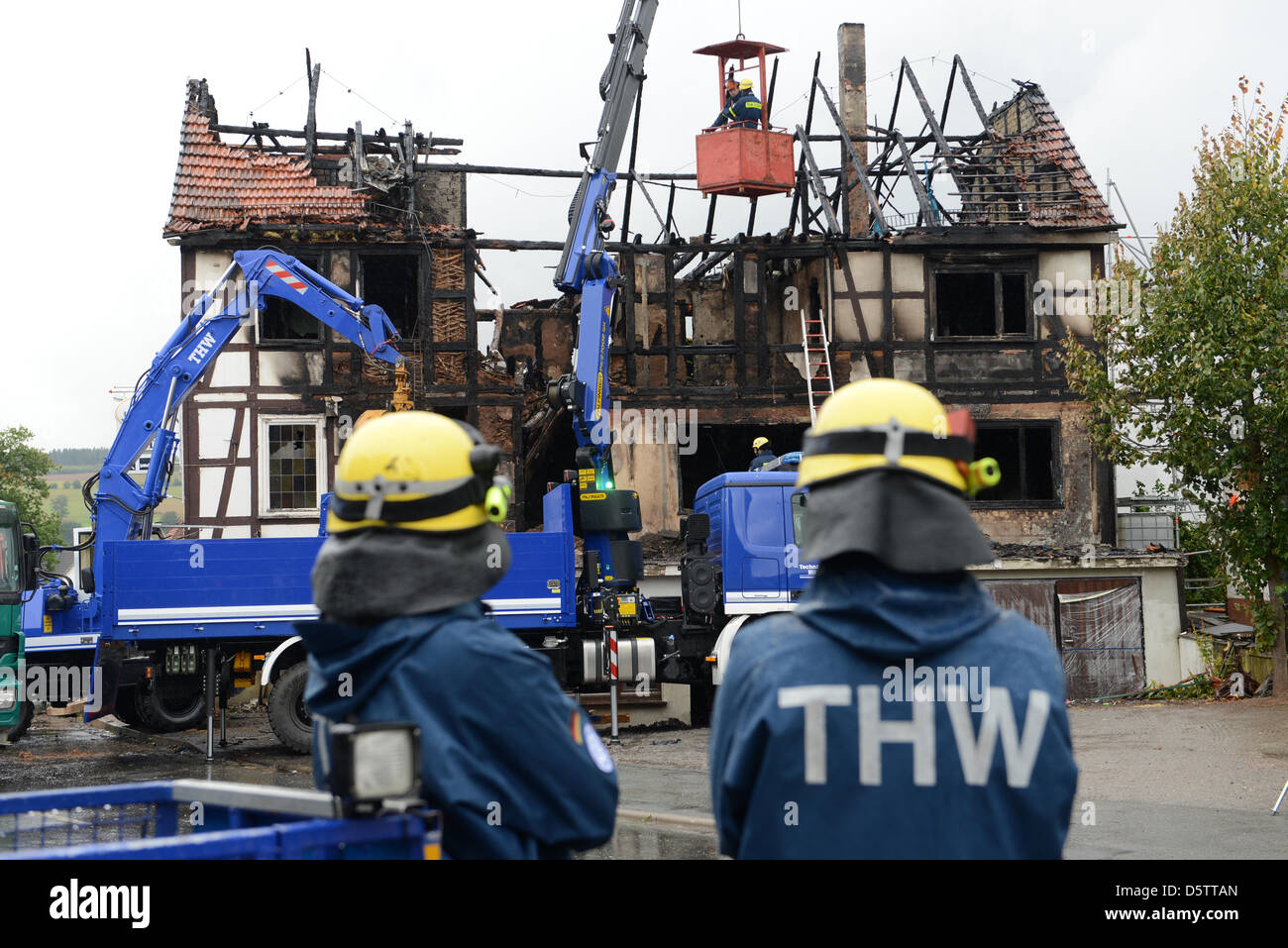 Federal Agency For Technical Relief Thw Stand In Front Of The Burned Out Inn In Lichtenfels Neukirchen Germany 25 September 2012 Two Girls Are Still Missing The Bodies Of Two Women Were Removed On
